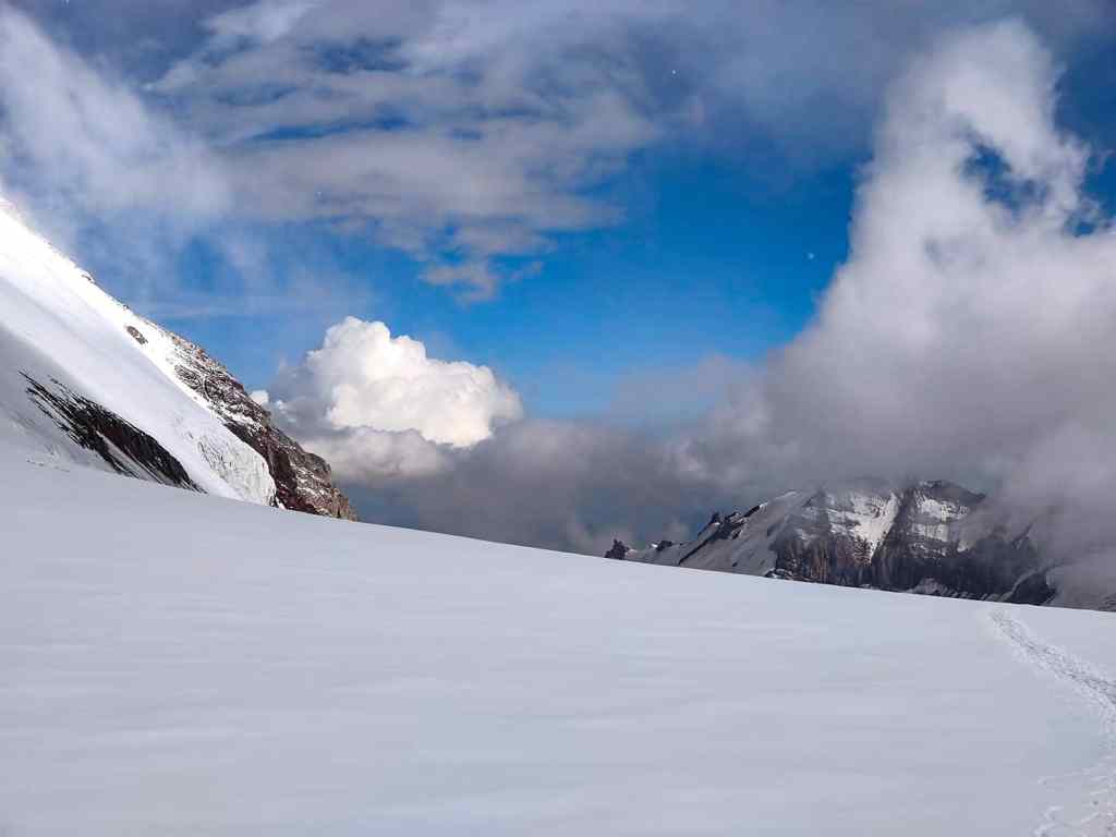 Leaving the rocky, solid ground behind, we ventured out into the barren glacial lands. We put our crampons on fast, the number of falling rocks in the Rolling Stones couloir was increasing significantly as the afternoon approached and temperatures rose. The first steps on ice felt comfortable, the more distance we gained from the massive couloir, the better. But also the glacier was a large area of traps and treacherous passages. Carved into its surface were huge crevasses. Like scars they were lingering on the immense ice field, some visible, most of them, though, hidden under thin layers of snow. Those created the most dangerous obstacles of the climb. A wrong step and the glacier would swallow you unconditionally. We roped up. If either one of us would fall, that braided string of nylon yarn would be the lifeline. We navigated around the crevasses, until one of them blocked the way. There was no other way to continue, we had to descend into the glacier’s icy belly. Shota went first. I was holding the rope tight, leaning slightly backwards. Carefully he walked towards the unforgiving world of ice, moving deeper into a hostile, cold environment. For a moment, Shota was gone, I pulled the rope, held it close to feel the resistance, making sure he was still there. Then he reappeared, climbing up the blue, icy wall on the upper site of the crevasse. He made it. A feeling of relieve. But now it was my turn. I waited until Shota was in a safe spot before approaching the blue abyss. Slowly, using my ice axe and crampons, I climbed into the crack, focusing on every move. Each step was carefully set only when I was sure that I was secured, either by my own actions or climbing partner. After a few meters, I reached a bridge created by a thin layer of snow, about 50cm thick, which had formed a temporary connection between both sides of the crevasse, below, nothingness. Iceacles trembled and broke, falling into the deep blue gap, while I was walking on the naturally formed bridge. It was only a matter of seconds until I reached safety. We continued, the skies cleared up with every meter of altitude gain, allowing amazing views.