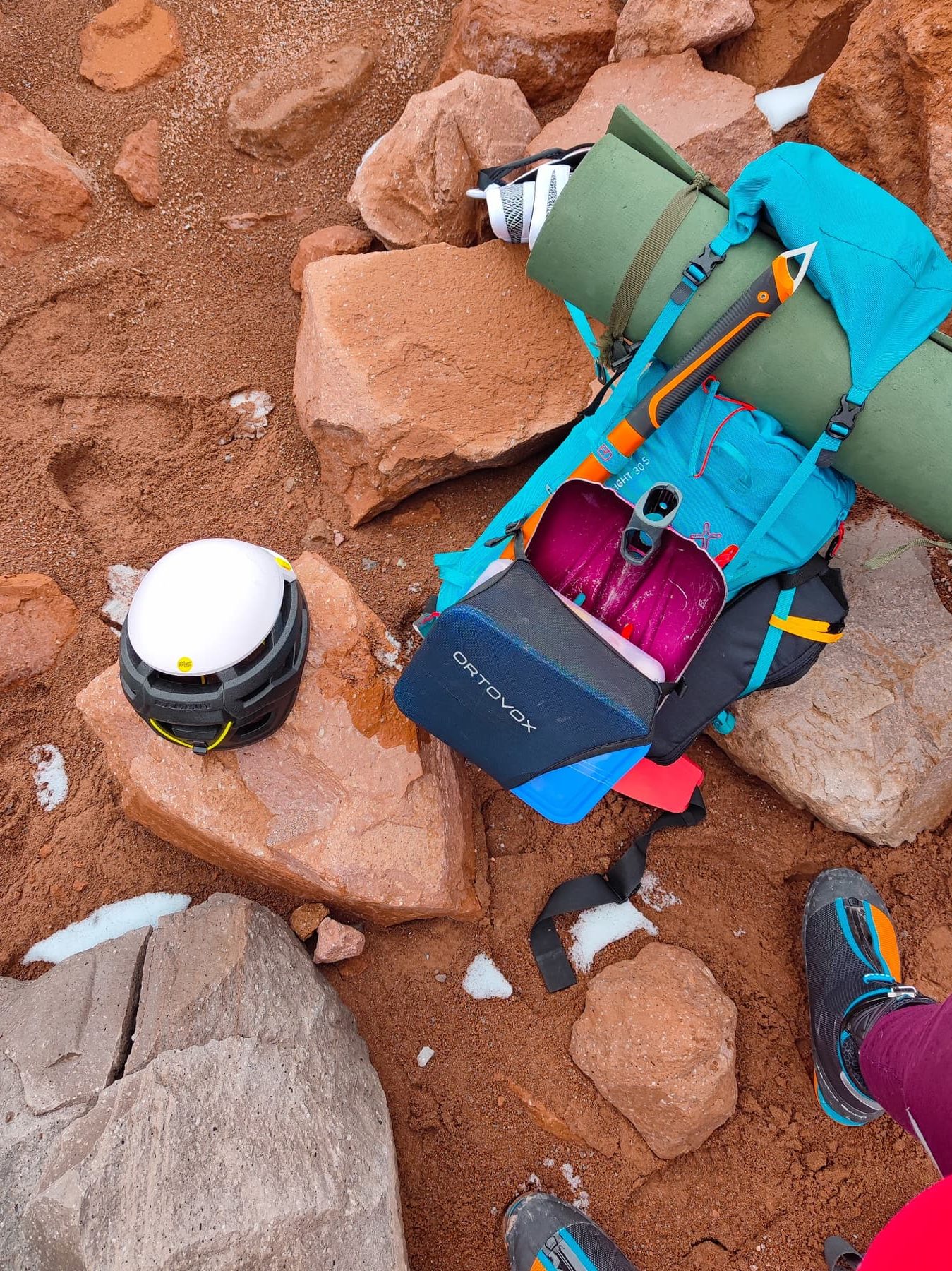 We hiked through alien like landscapes, white snow mixed with red sand and picturesque yet extraordinary rock formations gave the impression of rather being on a distant planet, out in space, than on a volcano on earth. I felt like I was roaming through the barren, extraterrestrial landscapes of our neighboring planet Mars and in fact, schedules, responsibilities, regular life, it all felt so far away, like I left it behind on a far away planet, it appeared so surreal and unreachable from where I was now. The red sand was easy to walk in, yet didn’t allow a good grip on steep sections. Shota’s friend, Ira, was so kind and helped us carrying the heavy gear for the first half of the climb. We had to hurry a bit, the particular section we crossed is called Rolling Stones. It’s an immense couloir, falling rocks are common and in fact, every minute, a big rock made it’s way from the upper plateaus, down the couloir. Helmets are mandatory, yet probably offer little protection from the huge debris. After a couple of hours, we reached the beginning of the glacier at almost 4000m ASL and got ready to put on our crampons. Now the interesting part shall start 🙂